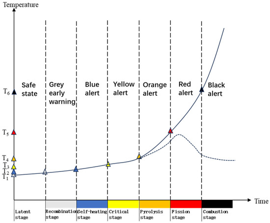 3. The gas detection method: When coal reaches a certain temperature, different concentrations and types of gases will be released, and the occurrence and release of these gases can accurately reflect the degree of oxidation and the spontaneous combustion of coal. Due to the heat production of coal oxidation and spontaneous combustion, the temperature of surrounding coal rock and air rises, and the pressure difference between the underground high-temperature site and the surface is generated, and the gas in the coal fire area migrates to the surface along this pressure gradient in the coal rock fracture [93,94]. Li et al. [95] determined the pyrolysis temperature, ignition temperature and starting temperature of different kinds of marker gases by analyzing the pyrolysis process of HQL and DY coal. Based on a comprehensive analysis of the marker gases and critical temperatures produced in various stages of CSC, the authors adopted the following methods: C2H2, C2H4, C2H4, C2H4, C2H4, C2H4, C2H4, C2H4 and C2H4, respectively. C2H6 is the evaluation basis for the classification of the CSC stage. This method divides the coal combustion process into four stages: the latent spontaneous combustion period, slow spontaneous combustion period, accelerated spontaneous combustion period and combustion period. In engineering practice, drilling experiments can be carried out at suspected high-temperature points on the surface, and the components of the collected gases can be analyzed by gas chromatography. The degree of the spontaneous combustion of coal seams is determined based on the critical concentration of CO and the type of gas, and the fire area range of the coalfield is delineated. Yue et al. [96] simulated coal seam spontaneous ignition by using a kg coal sample ignition test bench. Based on the analysis of indicator gases in the process of coal oxidation and temperature rise, and based on the original theory of dividing CSC stages, the early warning levels of CSC were further divided into seven stages, latent, composite, self-heating, critical, pyrolysis, fission and combustion, as shown in Figure 5. The prediction of the spontaneous combustion of coal is more accurate.