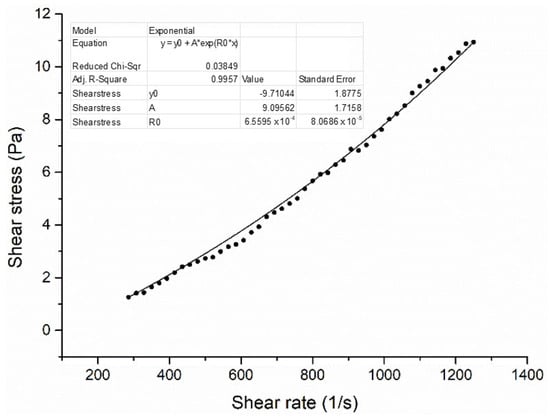 Viscosity measurements of the blends were conducted using an R/S plus rheometer. After switching on both the rheometer and the connected computer, the Rheo 3000 software was launched to control the measurement process. The connection between the rheometer and the computer was established through the software interface by activating the remote function on the rheometer. A concentric cylinder geometry and the CC25-coded sample chamber were mounted on the device, and the chamber was filled with the sample (25 mL) at the specified temperature to be analyzed. The measurement parameters, including the shear rate range (200–1250, 1/s), analysis duration (300 s.) and number of data (50) were defined within the software. The shear rate (1/s) and shear stress (Pa) data were recorded during the analysis. Viscosity values (Pa·s) of the blends were measured from the slope of the fitted curve drawn between the shear rate (1/s) and shear stress (Pa) data. The viscosity measurement graph of a blend (at 25 °C with ethanol) is shown in Figure 1 as an example.