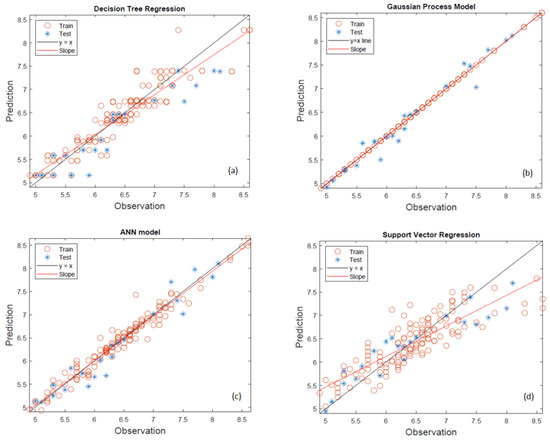 In the machine learning study conducted for viscosity, the viscosity values of 50 fuel blends measured at three different temperatures were modeled. The performances of the decision tree regression (DTR), Gaussian process regression (GPR), artificial neural network (ANN) and support vector regression (SVR) models for predicting the viscosity of the studied blends were evaluated through a comparison of predicted and observed values, as illustrated in Figure 2 for the machine learning models.