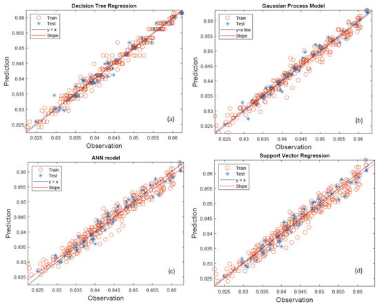 Scatter plot comparing predicted and observed density values for the machine learning models: (a) decision tree regression, (b) Gaussian process regression, (c) artificial neural network, (d) support vector machine.