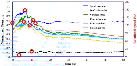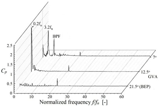 Normalized unsteady pressure in the draft tube at different guide vane angles [119].