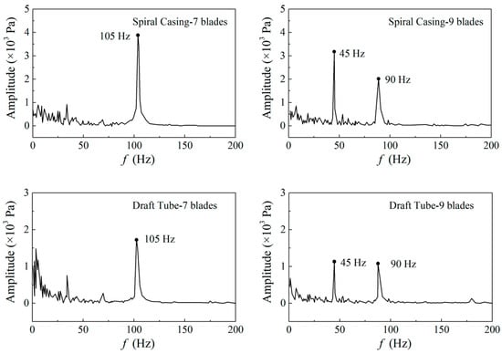 Frequency spectrums of pressure fluctuations in the spiral casing and draft tube [32].