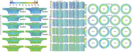 In the equation, is the amplitude of the modulated pressure pulsation. Equation (3) is used to determine the functional relationship between the pressure field and spatial–temporal variations during rotor–stator interaction. The diametral mode (k) caused by rotor–stator interaction is estimated by Equation (4):