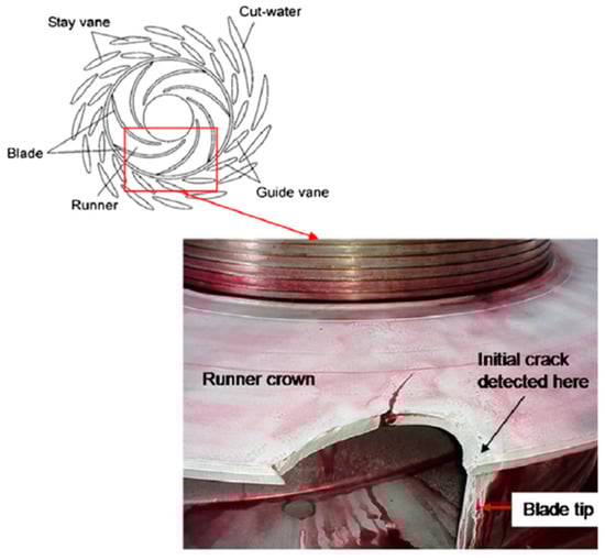In addition, during the start-up, shutdown, load changes, and operational condition transitions of pump-turbines, drastic changes in water flow velocity and pressure distribution occur, generating complex pressure pulsations [110]. These pulsations exert dynamic pressure loads on components such as the runner, guide vanes, and spiral casing, potentially leading to connector failure, reduced equipment reliability, and safety issues. When these dynamic forces coincide with the natural frequency of the components, resonance takes place. Under resonant circumstances, the forces undergo amplification [111], which further exacerbates vibrations and leads to fatigue cracks or structural component damage [22], as illustrated in Figure 13.
