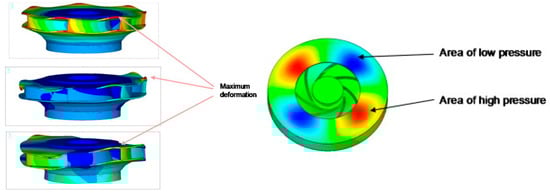 To clarify the mechanism of rotor–stator interaction between pump-turbine runner blades and guide vanes, Nicolet et al. [112] constructed a simplified hydroacoustic model of excitation sources driven by valve grids between stationary and rotating components, based on the flow field distribution in the vaneless zone, and derived the impact of resonance conditions on pressure pulsations. Egusquiza et al. [22] investigated the flow-induced vibration caused by rotor–stator interaction in a pump-turbine with 7 blades and 16 guide vanes. They observed that the maximum deformation of the runner occurred at the outer diameter where the blades connect to the crown—a key area exposed to pressure pulsations during operation, as shown in Figure 14. As depicted in Figure 15, the runner’s second-order natural frequency (186 Hz) was close to the excitation frequency (also a second-order mode shape), which resulted in severe runner vibration and eventually fatigue failure.