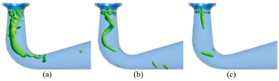 Under off-design operating conditions, vortex ropes and associated flow instabilities in the draft tube give rise to inadequate pressure recovery, thereby lowering the efficiency of reversible pump-turbines [116]. He et al. [117] performed numerical analyses of vortex ropes under 60%, 86.7%, and 100% load conditions, observing spiral vortex ropes at 86.7% partial load. As depicted in Figure 17, the flow in the draft tube was highly turbulent under 60% partial load, with heightened intensities of other vortices such as runner blade passage vortices. At low and high loads, the swirl intensity of vortex ropes was moderate, resulting in smaller pressure pulsation amplitudes in the draft tube; at medium loads, the swirl intensity was greater, leading to larger pulsation amplitudes; at 100% load, the swirl intensity was extremely low, and the pressure pulsation amplitude in the draft tube was minimal.