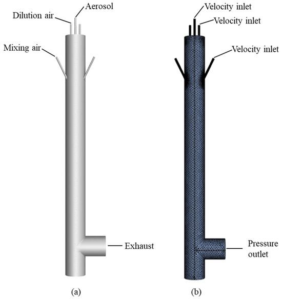 The geometric model of the aerosol mixing chamber with a diameter of 59 mm and total length of 700 mm is shown in Figure 1a. The top section contains one aerosol inlet pipe and three carrier gas inlet pipes; three dilution gas inlet pipes located at approximately 160 mm below the top are arranged at 60° inclination angles, evenly distributed along the chamber’s side walls. An exhaust outlet with a diameter of 59 mm is positioned 80 mm above the chamber’s base.