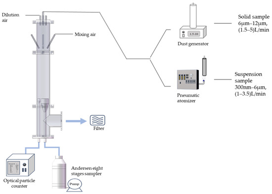 There were three components in our experimental equipment, i.e., an aerosol generation system, an aerosol mixing chamber, and an aerosol detection system, as illustrated in Figure 2. In this study, test aerosols with particle sizes ranging from 0.3 to 10 μm were generated using an atomizer generator (Kanomax, Suita, Japan) and a dust generator (Beijing Huironghe, Beijing, China) to produce aerosols in the 0.3–6 μm and 6–10 μm ranges, respectively. The atomizer generator obtains aerosol samples by impacting a suspension of polystyrene with airflow to produce droplets, which are subsequently dried into solid particles. This method could achieve polystyrene aerosol samples with high concentrations and exhibits high efficiency for generating small-sized polystyrene particles. The dust generator disperses solid samples into the air by adjusting vibration frequency, and the samples are then diluted and mixed with airflow to form aerosols. This demonstrates higher efficiency for generating large-sized particles.