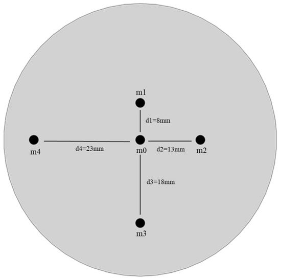 The sampling plane in this study is a 59 mm diameter circular plane. To assess the uniformity of aerosol concentration across this sampling plane, five monitoring points were selected: the plane’s center and four additional positions at radial distances of 8 mm, 13 mm, 18 mm, and 23 mm from the center. These points are labeled as m0, m1, m2, m3, and m4 (Figure 3).