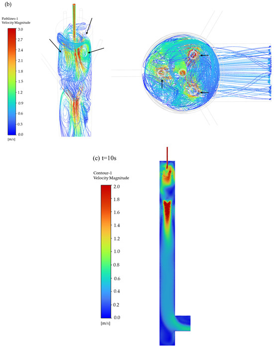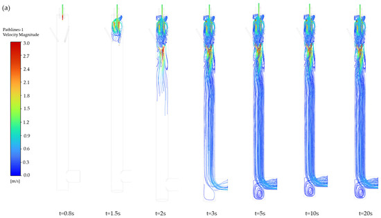 The pathlines of particles entering the mixing chamber at different times are illustrated in Figure 4a. The figure shows pathlines at different time points from 0.8 s to 20 s. The pathlines after 5 s are largely consistent, indicating that the flow has stabilized after 5 s. The particle motion process is as follows: after entering the chamber, the particles initially follow the downward airflow direction. Under the influence of three high-speed carrier gas streams positioned at the upper section, three vortices are generated (Figure 4b). The formation of vortices is caused by fluid curling induced by the velocity difference between the aerosol inlet flow (2.4 m·s−1) and the carrier gas flow (11.3 m·s−1). Additionally, since the device features three carrier gas inlets, three vortices are thus formed, which drive particle dispersion radially outward from the central region to the peripheral areas. Part of the particles become entrained in upward recirculating flows within these vortices, while others continue their downward migration. Subsequently, three additional high-speed dilution gases positioned at the chamber’s lateral walls induce other vortices, further enhancing particle homogenization through dynamic mixing mechanisms. Following this secondary dispersion phase, the particles continue their downward trajectory under controlled airflow conditions. This multistage process ultimately achieves uniform aerosol distribution across the sampling plane, ensuring spatial homogeneity of particle concentrations in the measurements.