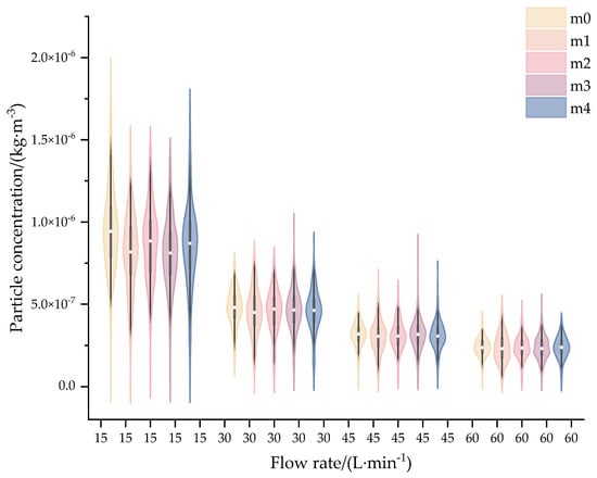 Figure 8 presents violin plots of aerosol concentrations at five monitoring points under different flow rates. The results reveal that as the flow rate decreases, the monitored aerosol concentrations progressively increase, with concentrations at 15 L·min−1 and 60 L·min−1 differing by approximately one order of magnitude. This trend is attributed to particle motion dynamics: reduced flow rates lower the velocities of both fluid and particles, extending the residence time within the chamber and thereby enhancing aerosol accumulation.
