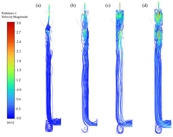 Particle pathlines at different flow rates. (a) 15 L·min−1, (b) 30 L·min−1, (c) 45 L·min−1, (d) 60 L·min−1.