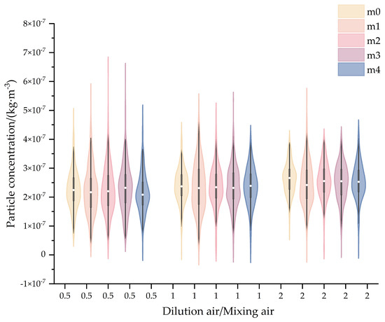 The carrier/dilution gas ratios were set as 0.5, 1, and 2. Figure 10 displays violin plots of aerosol concentrations recorded every 0.1 s across five sampling sites. As shown, the median aerosol concentrations at all sites remain largely consistent, with minimal impact from changes in the carrier/dilution gas ratio. Table 9 presents the RSD for simulated and experimental aerosol concentrations on the plane at different carrier/dilution gas ratios. It reveals that particle uniformity is optimal at the ratio of 1, though particle distribution remains relatively uniform at other ratios. This factor exhibits limited influence on particle mixing effectiveness.