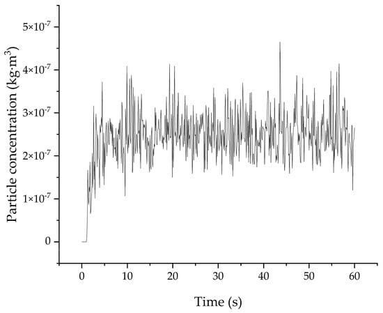 This phenomenon is related to the motion of aerosols within the mixing chamber. The small-sized aerosol particles are is susceptible to airflow and external forces, resulting in unstable dynamic states. The aerosol concentration on the plane reaches approximately 2 × 10−7 kg·m−3 after 5 s (Figure 11), followed by fluctuations around this level. Increasing the sampling time reduces the impact of these fluctuations on cumulative concentration measurements. Based on experimental and simulation results, a sampling period of 10 s–10 min is recommended. Periods shorter than 10 s may degrade aerosol uniformity on the plane, while durations exceeding 10 min leads to aerosol concentration decline, with extended sampling times failing to collect additional aerosols.