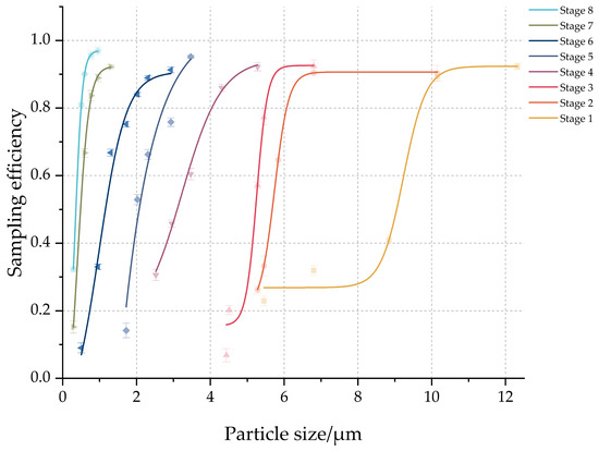 Based on the designed aerosol mixing chamber and calibration system, this study investigated the physical sampling efficiency of the Andersen eight-stage sampler at 28.3 L·min−1 using the upstream-downstream method for stage-by-stage evaluation. For each stage, at least four polystyrene particles of different particle sizes were tested. The efficiency curves were fitted using a Boltzmann sigmoidal function to determine the D50 values, which were then compared with the nominal cut-off diameters specified in the sampler’s manual (Figure 12 and Table 13).