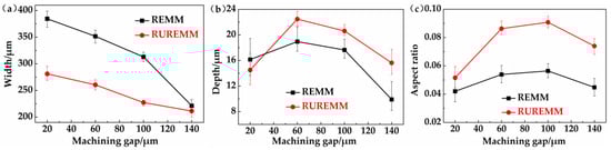 | Items | Machining Gap [μm] | Short Circuits | Width [μm] | Depth [μm] | Aspect Ratio |
