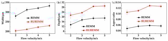 | Items | Flow Velocity [m/s] | Short Circuits | Width [μm] | Depth [μm] | Aspect Ratio |