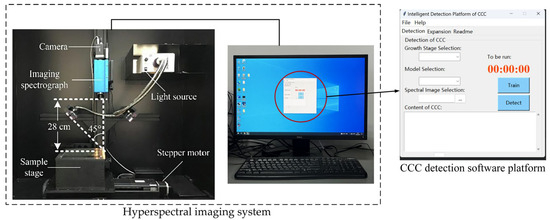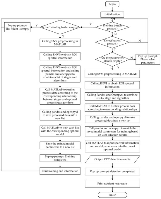 In the current spectral research and analysis—from the initial establishment of the research object to the final practical application—it usually includes processes such as collecting experimental samples, sample preparation, standard measurement of sample indicators, spectral collection, spectral data preprocessing, spectral modeling and analysis, model evaluation, model improvement, and practical application. These processes often have problems such as multiple platforms, difficult platform operation, and misoperation. This CCC intelligent detection system is designed to integrate the ENVI platform for spectral information acquisition and the MATLAB platform for feature data processing and model training detection into the Python central control platform, in response to the problems of complex operation and low efficiency that exist when spectral information acquisition, prediction model training, and nutrient detection are carried out on different platforms, to achieve automated invocation. By constructing a simple and easy-to-operate graphical interface, it is expected to reduce the usage and learning costs for personnel actually operating the CCC intelligent detection system.
