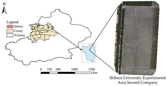 Samples were collected from the experimental grounds of the second company at Shihezi University in Xinjiang Uygur Autonomous Region (86.08° E, 44.31° N). This region is characterized by a temperate continental climate with temperature fluctuations and abundant sunshine, with annual sunshine hours ranging from 2500 h to 3500 h. The precise sampling site is illustrated in Figure 5.