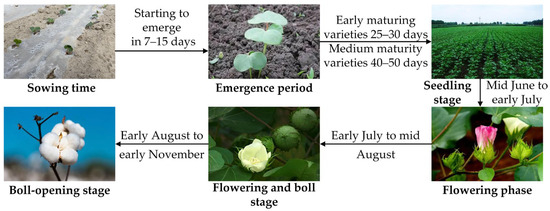 The research object of this article is DH10 cotton, and the samples were collected at three specific time points: 13 June (seedling stage), 10 July (budding stage), and 5 August (flowering-boll stage). The growth cycle characteristics of cotton are shown in Figure 6.