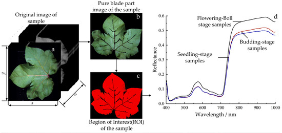 The research object of this article is chlorophyll in cotton leaves. The band with better chlorophyll expression is located in the visible light short-wave near-infrared band (400–1000 nm). Therefore, the spectral information of this band is extracted for the subsequent construction of the inversion model. The image segmentation method was utilized to delineate the regions of interest (ROI) for the samples obtained from the corrected images and to extract their respective spectral information [39]. The ROI selection steps in most studies include processing the samples to the same size and then extracting the information within a limited area. However, as the cotton leaves change during the growth process and chlorophyll is distributed throughout the entire leaf, in order to ensure the accuracy of the CCC monitoring system’s detection process, in this study, the ROI area was set to the entire leaf part excluding the stem. The raw images of the representative samples are depicted in Figure 7a. Given the clear color contrast between the leaf and the primary stem, as depicted in the leaf image, this study utilizes SVM for the identification and extraction of RGB values of individual pixels. These values serve as unique features for image segmentation. The sample images obtained are presented in Figure 7b. These images were later identified as the sample ROI, as shown in Figure 7c. Within this ROI, the average spectrum was determined by considering all pixels, which serves as the representative spectral information for the sample (Figure 7d).