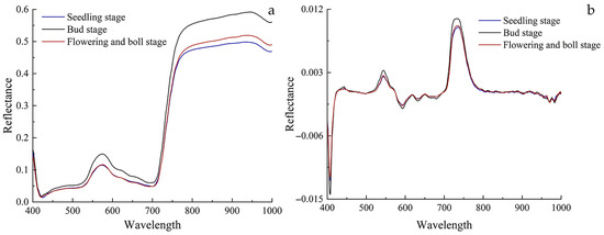Processed spectral reflectance data curve of cotton leaves: (a) Savitzky–Golay five-term quadratic smoothing; (b) first-order differential.