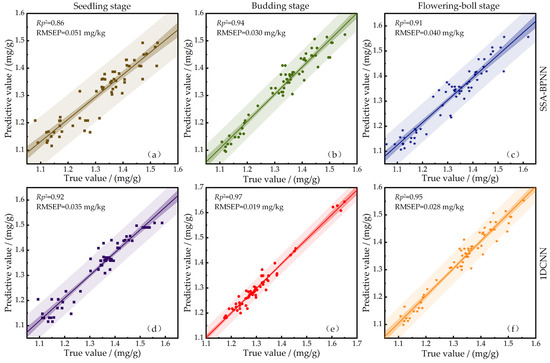 This study established the SSA-BPNN and 1DCNN detection models for chlorophyll content in cotton leaves during the seedling, bud, and boll stages using all wavelengths treated with SG. The evaluation results of the models are shown in Table 3. According to Table 3, the SSA-BPNN and 1DCNN models for cotton leaf chlorophyll content based on different periods of full wavelength have RPDs greater than 2, indicating good predictive performance of the models. During the seedling stage, the prediction set and RMSE of the 1DCNN model were 0.92 and 0.035 mg/g, respectively, with an RPD of 3.56, indicating superior model performance. During the budding stage, the prediction set and RMSE of the 1DCNN model were 0.97 and 0.019 mg/g, respectively, with an RPD of 5.54, indicating better model performance than SSA-BPNN. During the flowering-boll stage, the prediction set and RMSE of the 1DCNN model were 0.95 and 0.028 mg/g, respectively, with an RPD of 4.58. The model’s prediction performance was better than that of SSA-BPNN. Through comprehensive comparison, it can be concluded that the performance of the 1DCNN model is superior to that of the SSA-BPNN model in all three stages.
