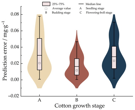The SG-1DCNN model is embedded in the detection module of the CCC intelligent detection system to detect the chlorophyll content of cotton at three development stages. In each group of experiments, 30 samples were randomly selected; each sample was tested seven times, and the results were taken as the average. The conclusion inspection results are shown in Table 4. The absolute value of the prediction error is shown in the violin box plot in Figure 10.