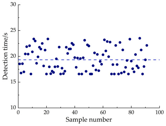 In order to explore the operation speed of the CCC intelligent detection system, 30 samples of cotton leaves at the seedling stage, budding stage, and flowering-boll stage were randomly selected, and the detection time of 90 groups of samples was recorded (Figure 11). As shown in the figure, the blue dots represent the detection time of each sample, and the blue dotted line represents the average detection time of the 90 samples. The fastest detection speed of the system was 16.57 s, and the slowest was 24.68 s. The average processing time of the system was calculated to be 19.33 s. The system was stable and could meet the application requirements for the rapid detection of chlorophyll content in cotton leaves.