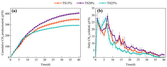 Methane production at different TS proportions. (a) Cumulative methane production; (b) daily methane production.