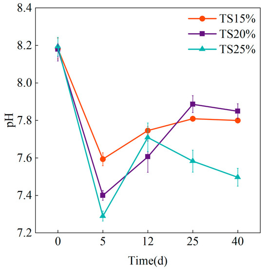 The changes in pH at different solid contents are shown in Figure 2. The pH changes of the system under the three groups of solid content all showed a trend of rapid decrease followed by a gradual increase, and the pH of each group fluctuated between 7.2 and 8.2 throughout the experimental process. The experimental data showed that the pH of the TS = 25% group decreased rapidly from 8.19 to 7.29 in the initial stage, and the decrease was more than that of the TS = 15% and TS = 20% groups in both cases. This is closely related to the rapid hydrolysis and acidification process of high organic matter at high TS [25]. The reduction of mass transfer efficiency under high TS (>20%) leads to the local accumulation of VFAs, which in turn triggers a sudden drop in pH. The elevated initial organic loading in the TS = 25% system stimulated hydrolytic consortium metabolism; however, increased viscosity hindered timely VFAs consumption by methanogenic archaea, thus inducing accumulation-driven acidification risks.
