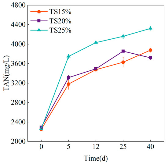 The variation process of TAN with anaerobic digestion time in a dry anaerobic digestion system under different TS proportions is shown in Figure 3.