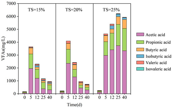 During the anaerobic digestion process, TS had a significant effect on the dynamics of VFAs. As shown in Figure 4, the concentration of VFAs showed significant differences under different conditions of TS. During initial anaerobic fermentation, VFAs concentrations increased rapidly across all groups, with accumulation escalating proportionally to TS elevation from 15% to 25%. The TS = 25% system reached 4652 mg/L, significantly higher than TS = 15% (3648 mg/L) and TS = 20% (4095 mg/L), primarily due to enhanced organic hydrolysis at higher TS. As fermentation progressed, TS = 15% and TS = 20% systems exhibited significant VFAs reduction, while TS = 25% continued accumulating to 6217 mg/L. This persistent accumulation indicates delayed acidification and methanogenic inhibition in high TS systems [34].