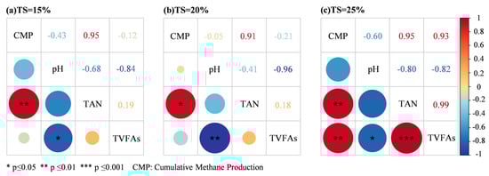 A correlation analysis of pH, TAN, TVFAs and cumulative methane production under different solid content rates was conducted to reveal the relationships between different stability parameters and methane production. The correlation analysis is shown in Figure 5. Stability parameters exhibiting significant correlations with methane production differed across TS gradients, as did the inter-parameter relationships, indicating that mechanisms governing methane yield variations and system stability operate through distinct pathways at different solid concentrations.