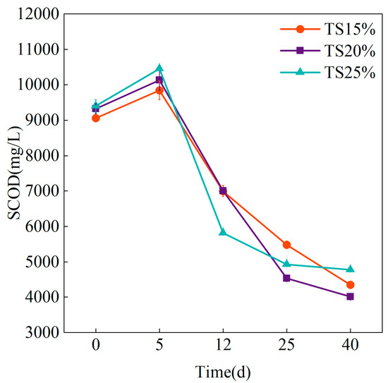 The changes of SCOD under the conditions of different TS throughout the whole process of dry anaerobic digestion are shown in Figure 6. Different experimental groups showed similar patterns of change, and all of them were in the degradation model of first accumulation and then rapid consumption. Initial SCOD concentrations increased across all groups, with TS = 25% peaking at 10,454.33 ± 20.55 mg/L on day 5—marginally exceeding TS = 15% (9847.01 ± 265.23 mg/L) and TS = 20% (10,134.22 ± 294.60 mg/L). This pattern suggests elevated organic loading under high TS conditions enhances hydrolytic bacterial activity in anaerobic digestion. The rapid decomposition of complex organic matter (e.g., cellulose, hemicellulose) resulted in the release of more soluble substrates. It is worth noting that the SCOD depletion rates of the experimental groups differed in the later stages of the reaction, with the SCOD concentration of the TS = 25% group gradually decreasing from 5811.2 ± 17.87 mg/L on day 12 to 4773.33 ± 13.05 mg/L on day 40, and the decreasing curve tended to be flat. Contrastingly, the TS = 20% and TS = 15% systems exhibited accelerated SCOD depletion, decreasing from 6997.87 ± 150.75 mg/L and 7008.32 ± 21.21 mg/L (day 12) to 4354.33 ± 18.91 mg/L and 4014.32 ± 3.53 mg/L, respectively. This rapid depletion contrasts with high TS systems where methanogenic pathway mass transfer limitations during late stage operation impeded efficient soluble substrate consumption, thereby impairing microbial SCOD utilization [38]. Comparatively, the TS = 15% and TS = 20% systems experienced substantially reduced impact.