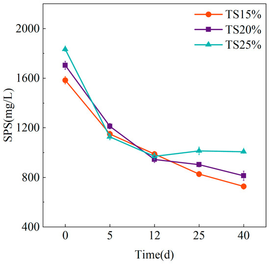 The TS = 25% system exhibited the highest initial SPS concentration (1833.33 ± 15.28 mg/L), which rapidly decreased to 1127.32 ± 24.39 mg/L within the first five reaction days before stabilizing at slightly elevated levels during late-stage operation. This stabilization pattern indicates SPS consumption lagged behind production in late-phase TS = 25% systems, likely due to reduced methanogen contact efficiency with continuously released substrates under high VS conditions. In contrast, the SPS in the TS = 15% and TS = 20% groups decreased from 1583.35 ± 30.55 mg/L and 1703.42 ± 32.16 mg/L to 726.85 ± 22.32 mg/L and 812.51 ± 36.74 mg/L at the end of the experiment. It also remained at almost the same level during the experiment, indicating that in dry anaerobic digestion, the increase in TS to 20% corresponded to the increase in organic loading could basically enable the system microorganisms to maintain a certain degree of degradation capacity for SPS.