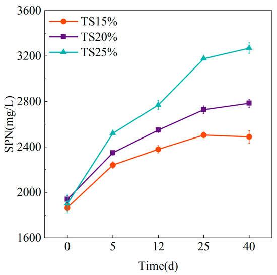 In anaerobic digestion systems, SPN—the principal soluble product of protein hydrolysis—serves as both a critical nitrogen source for heterotrophic microorganism metabolism and a key nitrogen cycle indicator. SPN undergoes degradation through two primary metabolic pathways: direct conversion by acidogenic bacteria into VFAs and TAN, or initial deamination to NH3 followed by direct methanogen utilization. Consequently, SPN concentration dynamics reflect the equilibrium between hydrolysis rates and subsequent metabolic consumption. The changes of SPN under different TS proportions are shown in Figure 8. It can be observed that the concentration of SPN under the three groups of TS shows a continuous increasing trend with the increase of fermentation time, but the accumulation rate and magnitude of the SPN differs under different TS proportions. The concentration of SPN in the group of TS = 25% increased continuously from the initial 1898.90 ± 78.36 mg/L to 3270.07 ± 47.86 mg/L by day 40, which was 72.3%, while the concentration of SPN in the TS = 15% and TS = 15% groups was 72.3%, and the concentration of SPN in the groups of TS = 25% and TS = 15% was 72.3%. The SPN of the TS = 15% and TS = 20% groups was 2489.05 ± 55.11 mg/L and 2783.45 ± 36.01 mg/L, respectively, by the end of the experiment, with increases of 33.4% and 43.5%, respectively. This indicates that more macromolecular organic matter is converted to SPN at higher TS, and the continuous increase of VFAs and TAN is significantly correlated with the continuous and substantial increase of SPN. The content of SPN in TS = 15% and TS = 20% tended to stabilize by the late stage of the experiment, which suggests that the microorganisms in the system consume SPN at a rate gradually exceeding the rate of hydrolysis of macromolecular organic matter in a metabolic equilibrium state. These results indicate that the consumption rate of SPN by microorganisms in the system gradually exceed the hydrolysis rate of macromolecules and are then in metabolic equilibrium.