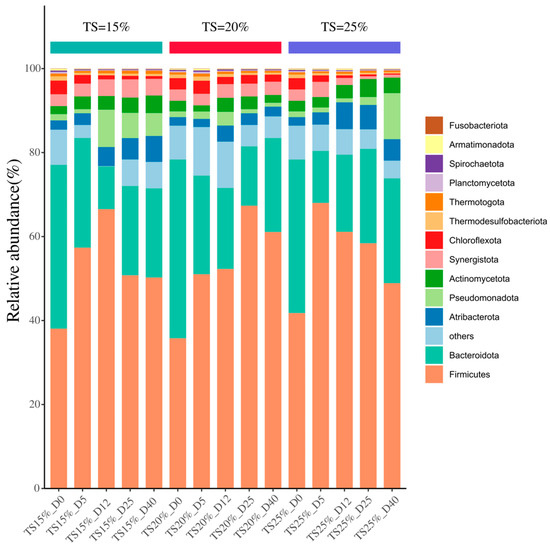 At the early stage of fermentation, the relative abundance of Firmicutes dominated in all three groups of solids-containing systems, with a relative abundance of 38.1%, 35.7%, and 41.7%, respectively, in each group, and the relative abundance of Bacteroidota was 39.0%, 42.6%, and 36.6%, respectively; these two phyla together constituted the core bacterial flora of the initial community. This phenomenon was highly correlated with the initial hydrolysis stage of easily degradable organic matter such as carbohydrates and proteins in kitchen waste, and the two types of bacterial flora rapidly initiated substrate decomposition through synergistic metabolism. The relative abundance of Firmicutes exhibited an initial increase followed by a decline throughout fermentation, peaking in the TS = 25% system on day 5. This maximal abundance corresponds to both the highest hydrolytic acidification intensity and initial methane production peak in high TS kitchen waste anaerobic digestion. The relative abundance of Bacteroidota, on the other hand, showed a continuous decreasing trend, and its attenuation may be related to the selective inhibition of the acidic environment due to the accumulation of VFAs and the fact that some parthenogenetic hydrolyzers of this clade (e.g., Bacteroides) were sensitive to low pH, while the competitive advantage of methanogens gradually came to the fore. Notably, the experimental group with TS raised to 25% showed an abnormal increase in Pseudomonadota abundance at the late fermentation stage, which was significantly higher than the concurrent level of the other two groups with lower TS. Combined with its metabolic properties, it was hypothesized that the high TS might lead to localized mass transfer limitations, which triggered fatty acid accumulation and then activated Pseudomonadota with resilience properties to maintain the system’s stability. Furthermore, increasing TS to increase the organic load of dry anaerobic digestion of kitchen waste, the microbial community structure during the process did not vary much and would show similar trends with fermentation time.