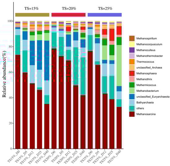The succession pattern of archaeal genus level communities is shown in Figure 10. The main dominant groups in each TS group are Methanosarcina, Bathyarchaeia, unclassified_Euryarchaeota, Methanobacterium, Methanosphaera, etc. At the initial stage of fermentation, Methanosarcina was absolutely dominant in all three groups with relative abundances of 73.6%, 78.6%, and 76.6% in the three TS groups, respectively, indicating the dominant role of the acetic acid-cracking methanogenic pathway in the initiation phase of the system. However, its relative abundance showed a significant decreasing trend as the fermentation process advanced, decreasing to 35.2% in the TS = 15% group, 41.9% in the TS = 20% group, and 32.6% in the TS = 25% group by the end of the experiment. This phenomenon is closely related to the rapid depletion of acetic acid in the substrate, which directly limits the metabolic activity of Methanosarcina colonies that depend on acetic acid as a substrate [45]. This trend corresponds to declining acetic acid concentrations in the TS = 15% and 20% systems during the mid-late experimental phases; conversely, high TS systems exhibited acetic acid accumulation, likely reflecting a reduced relative abundance of acetogenic microorganisms and consequent diminished metabolic utilization. In addition, the sustained enrichment of Bathyarchaeia in the TS = 15% group ranged from 4.84% at the beginning of the experiment to 11.6% at the end of the experiment, suggesting that it may play a key biocatalytic role in the late transformation of difficult-to-degrade substrates in TS = 15%.