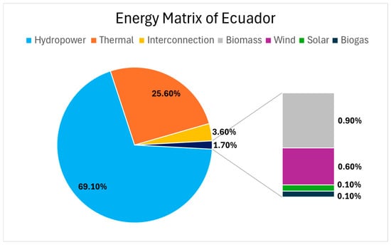 With a coastline of approximately 640 km, Ecuador possesses significant potential for wave energy generation. In 2024, the country experienced power outages lasting up to 14 h per day, caused by an energy crisis due to a long-lasting drought that began in September 2023. Ecuador’s energy matrix is heavily dependent on hydropower, which accounts for 69.1% of total generation, followed by thermal energy, 25.6%, energy via interconnection, 3.6%, and other renewable sources such as biomass, 0.9%, wind, 0.6%, solar, 0.1%, and biogas, 0.1% [4]. Figure 1 illustrates the relationship between energy sources in graphical form. This situation highlights the critical vulnerability of the national energy system due to its strong dependence on hydropower.