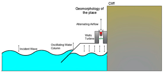 The OWC system captures wave energy by exploiting the vertical motion of water within a partially submerged chamber. Its operational principle is based on the pioneering work of Professor Yoshio Masuda [9]. As ocean waves enter the chamber, they cause the water column to oscillate, thereby compressing and decompressing the air above it. This bidirectional airflow is directed through a specially designed turbine that rotates in a single direction regardless of the airflow direction. The turbine is coupled to an induction generator connected to the electrical grid, enabling the conversion of mechanical energy into electrical power. The operational concept is illustrated in Figure 3.