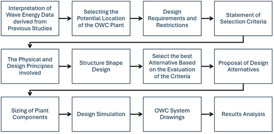 Figure 4 illustrates the design of an OWC plant methodology. It begins with a literature review, evaluates potential sites, and selects the most suitable location. Subsequently, design parameters and criteria are established, leading to conceptual design development. The performance of the OWC system is assessed in two stages. The first stage, conducted using OpenFOAM, simulates ocean behavior at the selected site to determine water pressure and velocity characteristics. The second stage analyzes the pneumatic airflow that drives the Wells turbine.