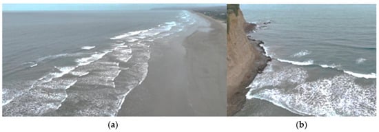 Panoramic view of La Entrada-Olón in the province of Santa Elena. (a) shows the low beach relief characteristic of the La Entrada–Olón. (b) displays a coastal zone with pronounced erosion and high cliff relief.