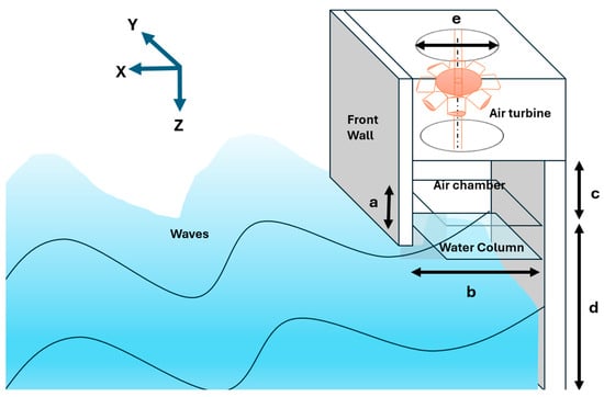 The characteristics of the incident waves directly influence the design of the pneumatic compression chamber. Figure 7 illustrates the key dimension considered in the geometric sizing of the Oscillating Water Column system. In this context, “a” denotes the submerged depth of the system’s front wall, “b” represents the width of the air chamber, “c” indicates the height of the air chamber, “d” corresponds to the sea depth measured from the reference point at the seafloor, and “e” refers to the diameter of the flow conduit directing air toward the turbine.