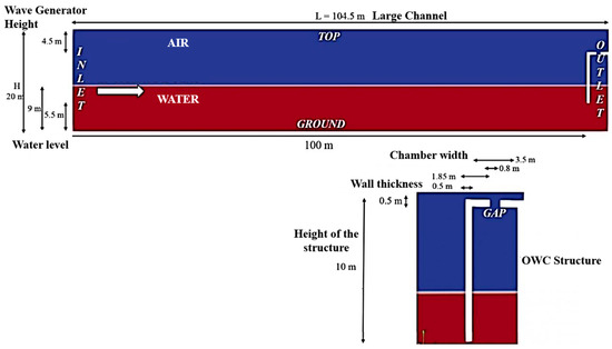 The computational domain can be seen in Figure 8 and was constructed using hexahedral mesh blocks, with a bottom element size of 0.04 m to ensure adequate resolution near the seabed. The complete domain size is 104.5 m in length and 20 m in height. The water phase within the domain ranges from a minimum wave through height of 5.5 m in width and 10 m in height, with a wall thickness of 0.5 m. The outlet duct, which channels compressed air toward the turbine, has a width of 0.8 m. It is important to note that one of the key assumptions is the use of two-dimensional (2D) geometry in the OpenFOAM simulations. The three-dimensional (3D) modeling will be developed in the second stage, based on the assumption that the results are proportional across each unit of transverse area.