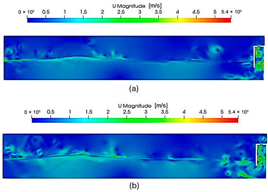 Figure 9 presents the velocity magnitude contours at 60 s and 120 s at two specific time instants. As this is a dynamic analysis, these time points were selected to assess the development of the flow field and observe system behavior approaching the end of the simulation period. At 60 s, a concentrated region of elevated water velocity is evident within the chamber, corresponding to the formation of the oscillating water column. Additionally, the incident waves can identify high-velocity profiles before reaching the structure’s front wall. By 120 s, the influence of the front wall on flow acceleration becomes more pronounced. The seabed also contributes to flow acceleration through boundary effects. The parameter under analysis shows a marked increase in velocity near the structure, primarily attributed to the constructive interference of incoming waves. This interaction facilitates a partial energy transfer to the structure, with the most significant effect being the localized rise in velocity both around and within the internal chamber of the system.