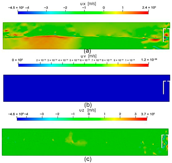 Contours of velocity components after a 120-s simulation. (a) Velocity in X direction, (b) velocity in Y direction, and (c) velocity in Z direction.