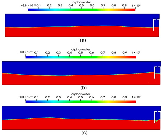 Figure 11 illustrates the water volume fraction obtained from the two-phase simulation. Regions in red, corresponding to a numerical value of 1, represent the water phase, while regions in blue, with a value of 0, denote the air phase. The interface between these two fluids can be approximated as a pneumatic piston, effectively simulating a horizontal boundary within the chamber. The simulation and analysis were conducted over a single wave period. Results indicate that the mass distribution of water inside and outside the structure remains acceptable, preventing overtopping and flooding of the pneumatic chamber. The simulations are parameterized by wave period or frequency, which facilitates accurate modeling of wave height and the dynamic motion of the pneumatic piston within the chamber. The observed height differential between internal and external water levels also supports forming a linear profile, enabling a stable and proportionally consistent pneumatic airflow.