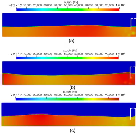 Water volume fraction contours (a) at 40 s, (b) at 80 s, and (c) at 120 s.