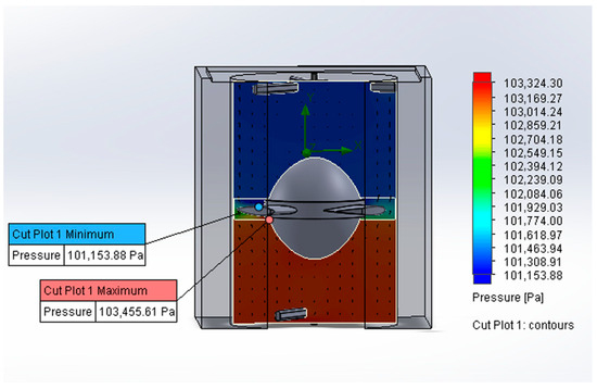 Figure 14 illustrates the behavior and pressure phenomena on a shear plane across the Wells turbine blades. The atmospheric pressure, defined as the upper boundary condition, creates a region of vector field stability. The lower section of the turbine shows high pressure because the turbine is in the impulse phase. As a result, the opposite side of the turbine experiences a low-pressure (vacuum) region, and this pressure differential generates the rotational inertia required to drive the turbine. This same effect can be observed when the pressure zones are reversed, due to the return motion of the ocean wave, which induces a vacuum state within the air chamber. However, due to the symmetrical airfoil profile of the Wells turbine blades, the rotation is maintained in a single direction, regardless of the airflow direction. Due to the idealized simulation conditions, a relatively low pressure distribution is seen throughout the domain except in the vicinity of the turbine blades, where localized variations are more pronounced.